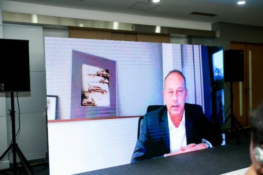 “开发未来汽车的全球挑战”主题的线上线下融合圆桌讨论。前排从左到右:圆桌讨论主持人、p站