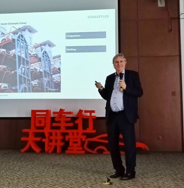 古兹默教授围绕“当前交通面临的问题与挑战”、“未来交通发展的趋势与展望”、“舍弗勒集团战略”及“舍弗勒集团创新型出行产品”四个方面展开讲座内容。