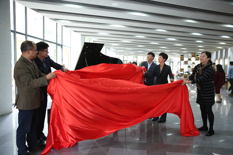 在随后的风采展示厅落成仪式上,马锦明老师、覃文忠老师、周宏武老师、张立军老师和曹静老师一同为钢琴揭幕。