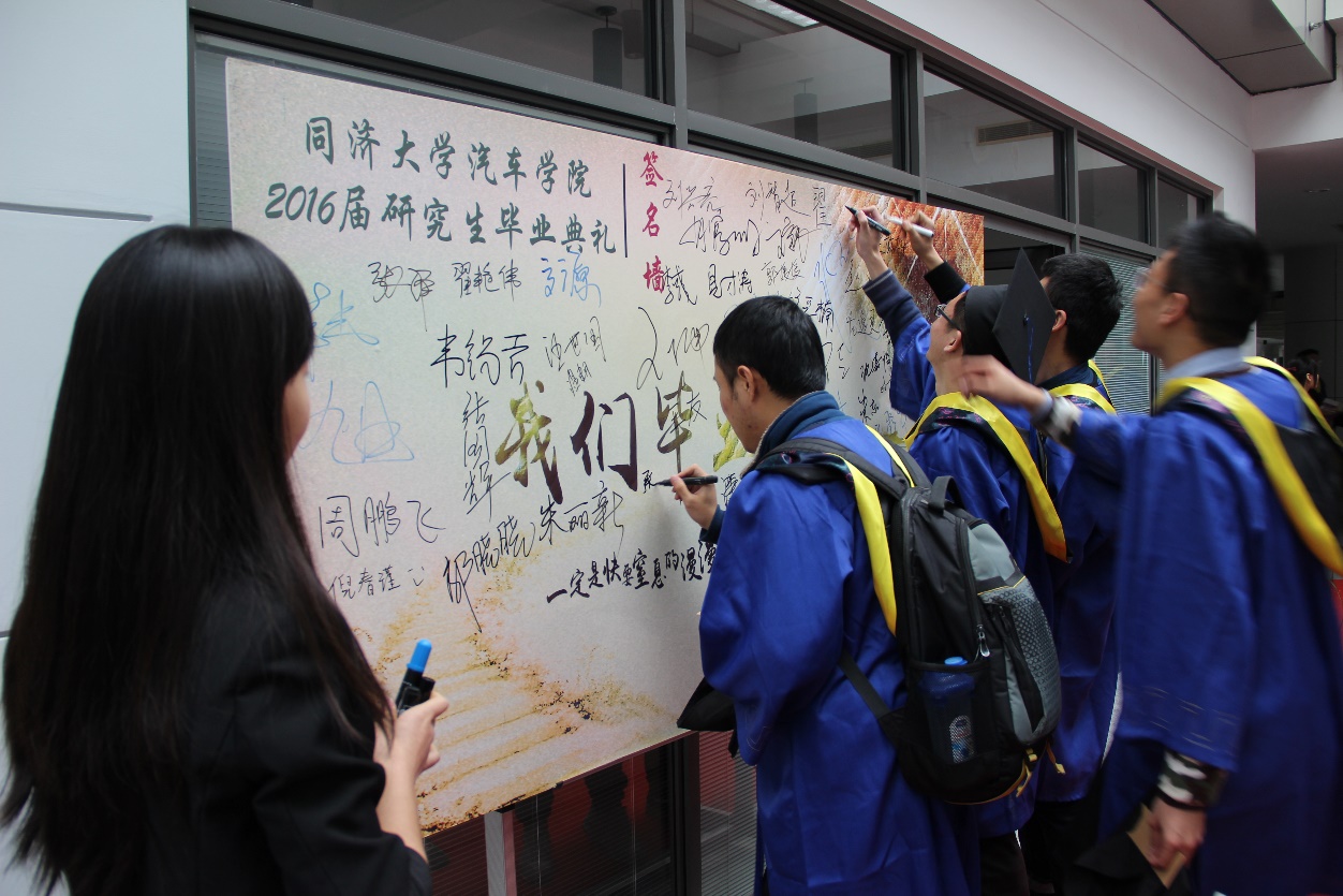 为每位2016届毕业生准备了特殊的毕业礼物——带有同济汽车元素的定制书签——希望同学们离开学校后仍能保持学习热情,不断用知识武装自己,勇攀人生高峰。而同学们为了感激母校的培育之情,也为学院献上了自己的答谢礼:捐一本书、种一棵樱花树、留下一本毕业纪念册、许下一个心愿、送一份特别礼。这份特别礼是由毕业生亲手制作的风铃,风铃阵阵,象征着离别时对同学的祝福和对母校的依恋,风铃上刻有毕业生姓名的小汽车挂件代表着2016届毕业研究生为汽车工业添砖加瓦的信心和抱负。
