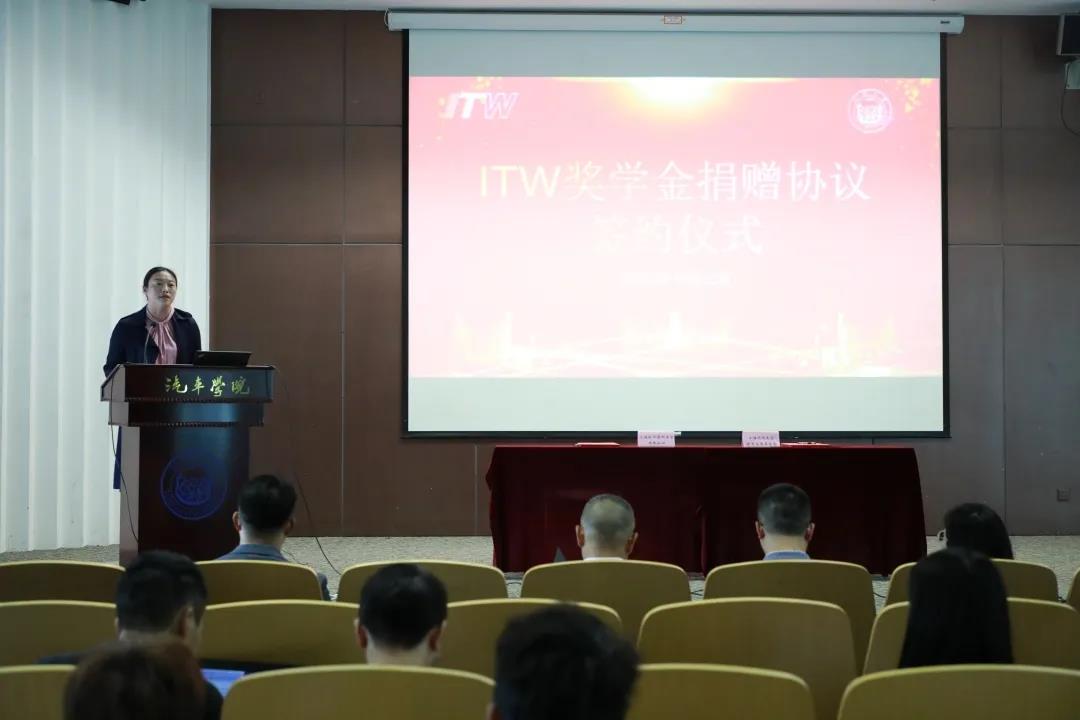 党委书记曹静致辞。她首先对ITW公司捐赠奖学金,助力学生发展表示感谢,并简要介绍了p站