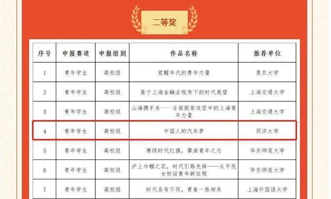 《中国人的汽车梦》主题微团课荣获2022年上海学校共青团主题微团课大赛二等奖。