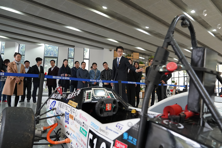 在曹卢老师的带领下,老师们还参观了“咖驿站”创新创业项目及造型小班优秀设计作品及大学生科技创新实践基地。同济电车队队员刘孟萱为来访的老师们讲解了学生车队往届赛季所设计制造的赛车。参观活动中,老师们对于学生们设计的各式各样汽车赞不绝口,纷纷拍照留念。