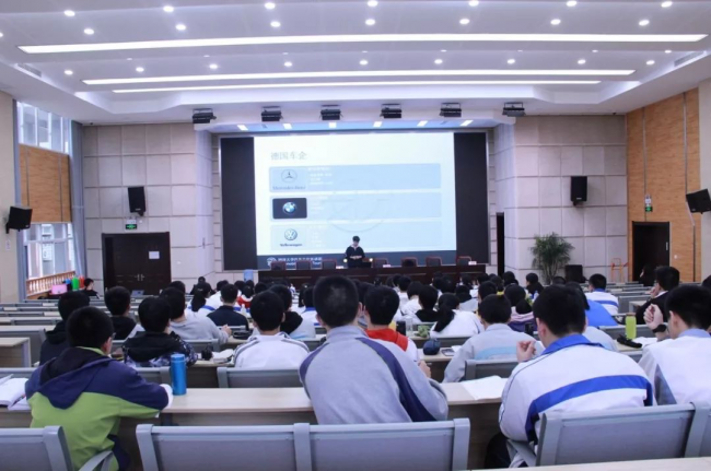 本科生二支部的鲁晨昱和王瑞同学进行了题为《大国汽车》的汽车文化宣讲。对中国汽车历史、现状、前景以及部分著名德国车企进行了一定的科普介绍,使桐乡市高级中学的同学们对汽车发展历程及文化形成有了更为深入的了解。汽车文化宣讲活动的开展有效提升了学生对汽车行业的兴趣,加深了学生对中国汽车工业发展的认知,激发了学生“汽车强国”的爱国情怀。