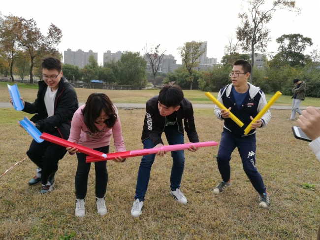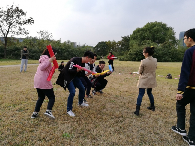 第二板块是“行”十九大,团队素质拓展。该板块包括飞夺泸定桥、齐心协力奔小康两个环节。飞夺泸定桥要求每组派三名代表进行接力比赛,使用所给道具,要求脚不能落地。齐心协力奔小康要求全组参与,接力传球,球不能落地。四个小组依次进行挑战,大家在欢声笑语中 完成了各项任务。