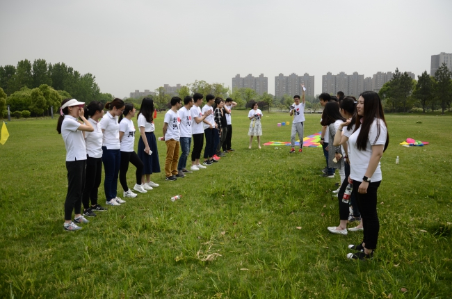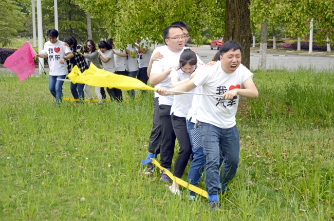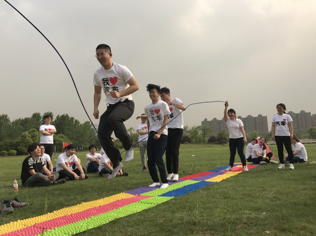 下午13:00,在主持人的引导下,参训队员分成五个小组,分别确定了组长,并设计了小组队名、队形、口号、队徽等,进行了各具特色的小组展示,进一步加深了组员间的相互了解。接下来“指压板传乒乓球”、“摸石头过河”、“有轨电车”、“车行万里”、“翻叶子”、“跳大绳”等丰富多彩的素拓活动,增强了大家的团队协作和沟通交流能力,而每一个活动项目都带给大家不同的体验:有的项目需要耐心与毅力,有的项目需要速度与激情,动静之间最离不开的成员之间的相互合作与理解。
