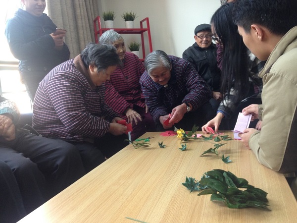 从嘉定校区出发,经历了十分钟的车程,同学们来到了嘉定区黄渡敬老院。敬老院的大门不大,白色的大门给人一种祥和之感,院内葱绿的花草树木与明亮的楼房呼应,平静而祥和。走进大楼,老人们已经纷纷坐在活动室里面,十分期待这一次的活动。志愿者们不但购买了香蕉、橘子等水果作为慰问品,还准备了一些文艺节目送给老人们。有优美的个人演唱,也有几位小组成员的合唱《强军战歌》。此外,为了增加老人们的动手训练,志愿者还带领着老人们共同完成一支支美丽的纸玫瑰的制作,敬老院里萦绕着欢声笑语。