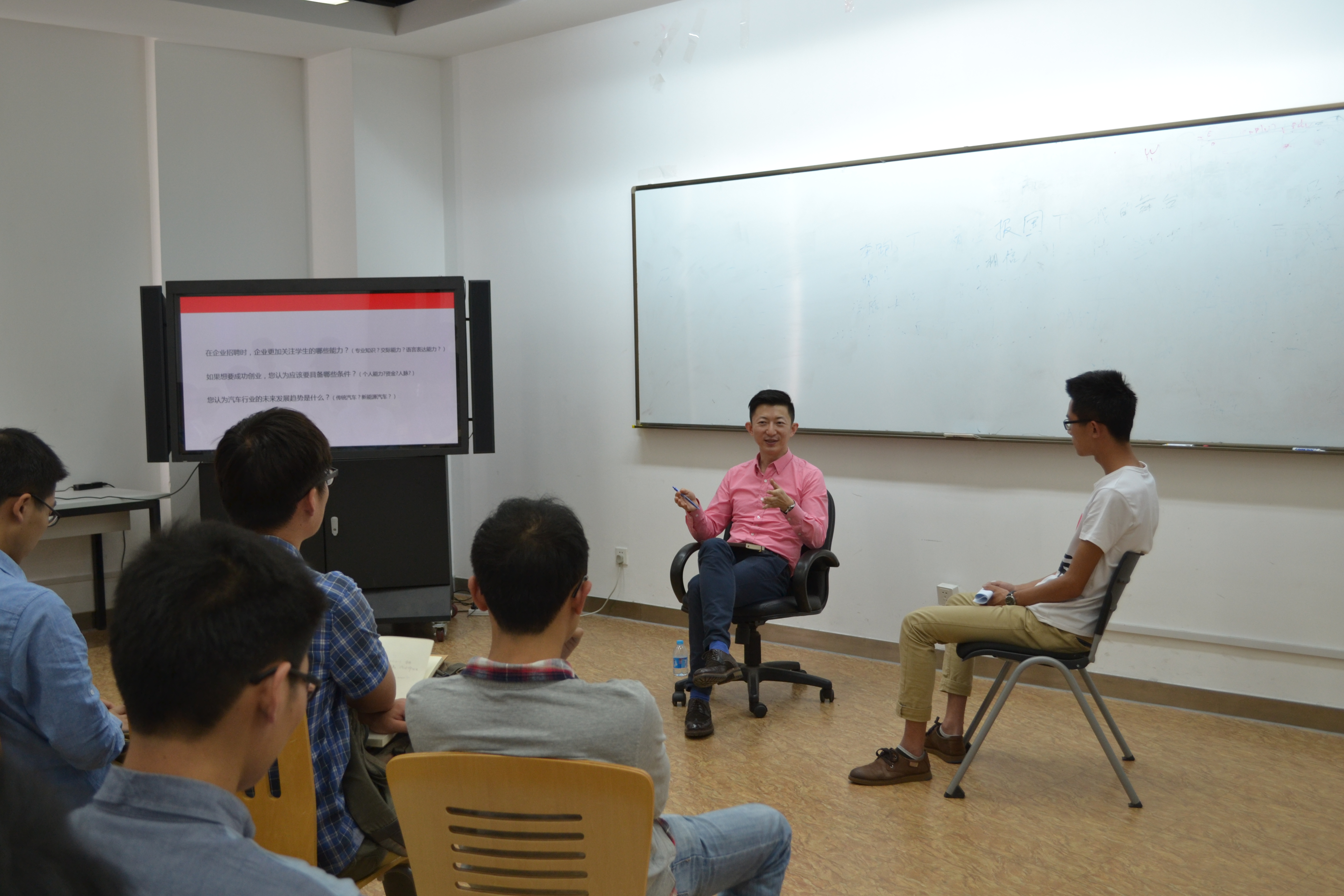 活动伊始,李冉学长向大家介绍他的咖啡吧以“水鱼”命名的缘由。随后,他分别从就业选择、职场发展、创业之路三个方面,生动而有趣地讲述他从泛亚到麦格纳,再到江森自控的工作经历,并亲切地回答学弟学妹们关于就业方面的问题。