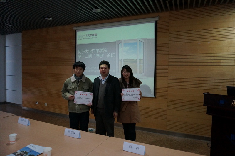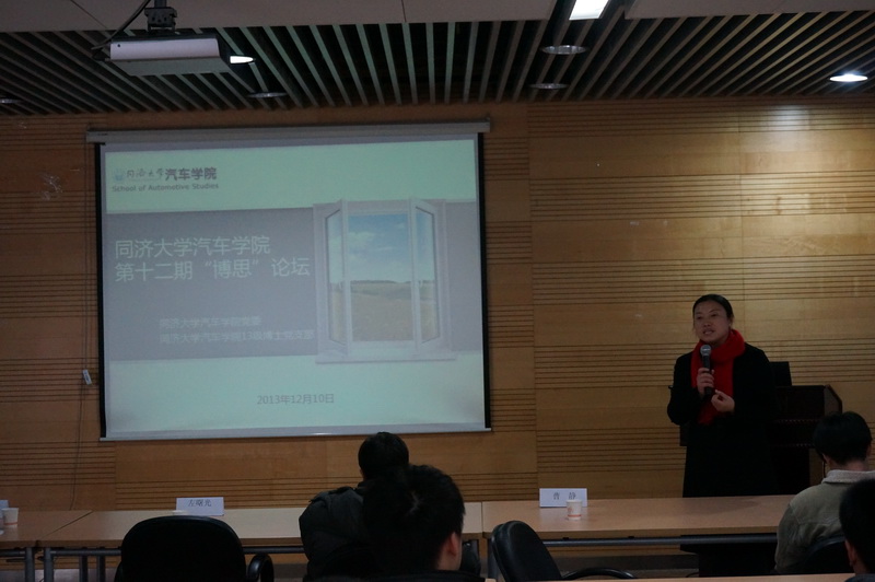 论坛首先由曹静老师致开幕词,表达了对广大博士的良好祝愿,以及对博思论坛持续举办的希冀。接下来,金驰博士和邱娜博士分别对各自的题目做了细致入微、深入浅出的讲解。金驰博士的主讲题目为《差动转向无人车辆控制简介》,主要介绍了无人驾驶的差动转向车辆的控制目标、动力学模型、控制策略等内容,详解了在无转向轮的情况下通过差动的控制使得车辆实现转向的构想,展示了实现这一构想的仿真与试验结果,特别是控制模型的建立体现出了极强的数学功底,令在场博士们赞叹不已。邱娜博士的主讲题目为《有机玻璃在汽车侧窗上的应用分析》,主要对有机玻璃这一汽车轻量化的重要材料的性能及其侧窗制品的力学、热学、声学性能进行了全面而透彻的分析,并对有机玻璃未来在汽车上的应用给予了展望,对在座的博士是一次极好的眼界开拓。