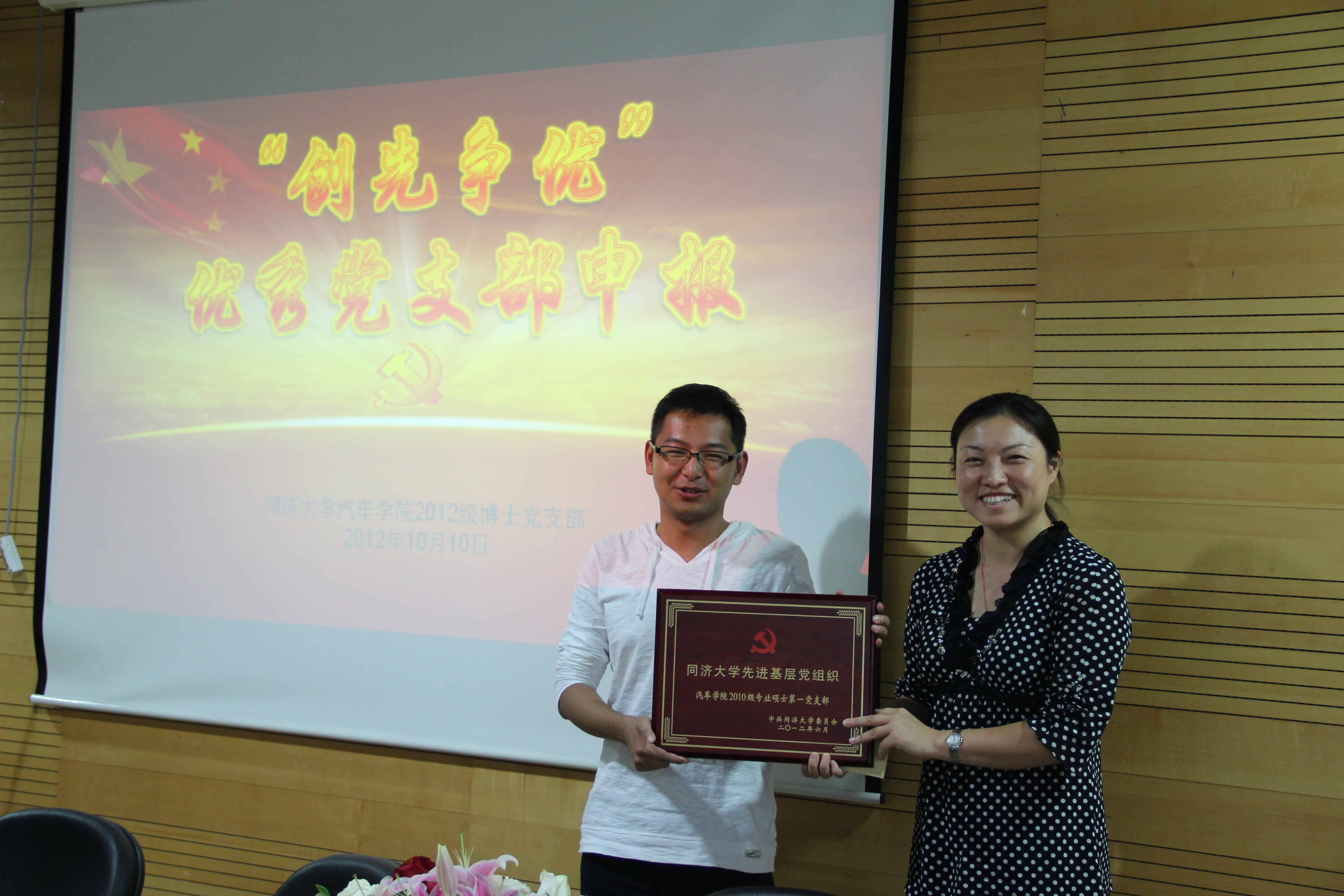 先进基层党组织”称号的2010级专业硕士党支部书记许翔颁发了证书和奖金,鼓励大家向优秀支部学习。随后,曹老师针对各支部的申报情况进行了总结和展望,曹静老师肯定了各个支部的工作计划,本科党支部有进步和创新,博士生党支部目标明确可行性强,硕士生党支部在传承中有所创新。曹老师要求各支部既要把学院的传统活动坚持下去,更要有针对性地去创新,提高活动的质量和水平,争取在通过落实各项工作计划,体现支部的先进性作用,发挥党员的力量,全面提高研究生党支部的凝聚力、战斗力。