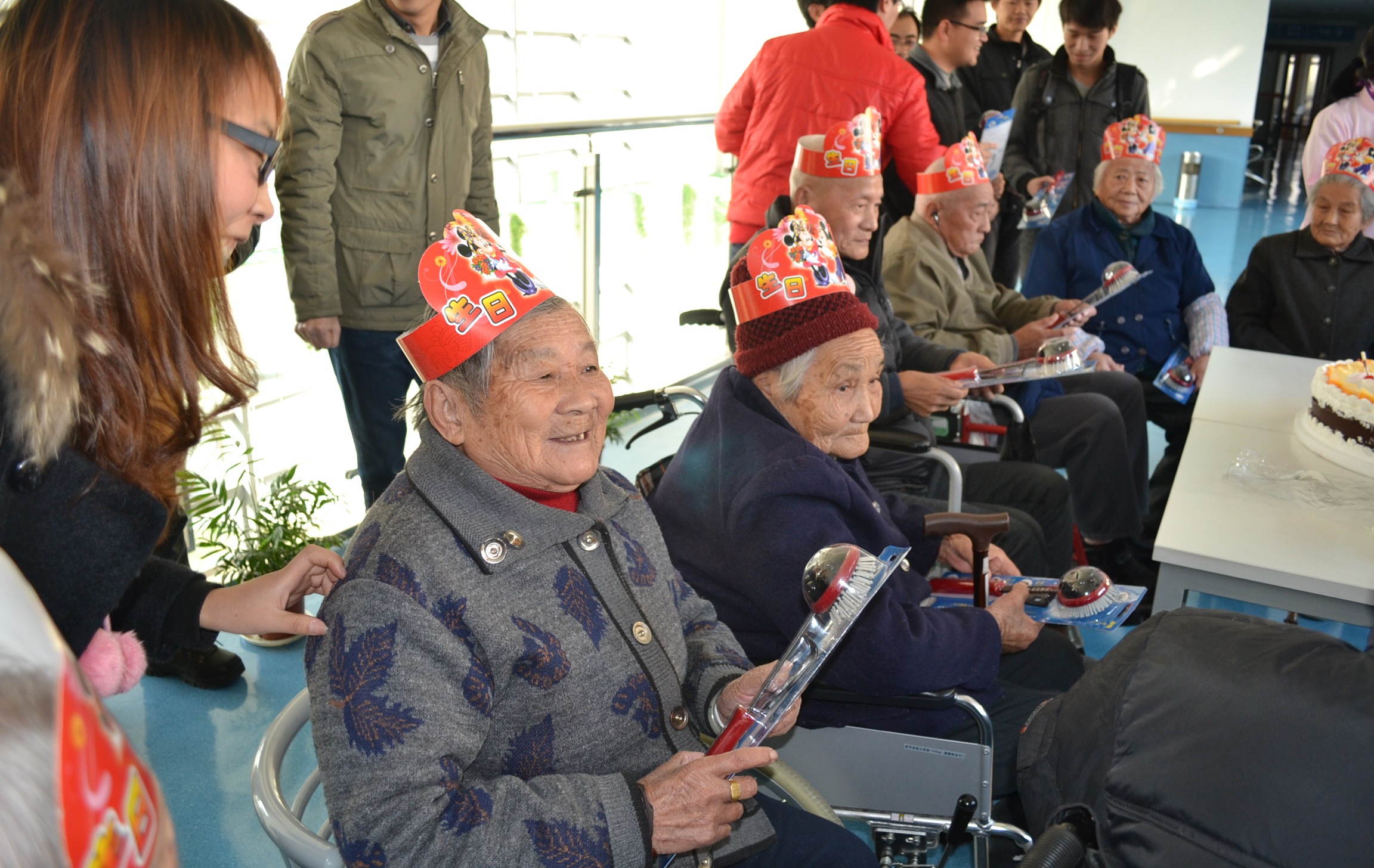 集体生日是黄渡敬老院每个月给本月内过生日的老人们集中举办的小型生日聚会。在敬老院的活动厅内,学生党员们热情地和老人们进行聊天交流,陪他们聊聊家常,聊聊敬老院的生活,聊聊我们的学习生活近况,聊聊老人们的故事等,给老人们的生活注入我们青春的活力和蓬勃的朝气。在学生党员的搀扶下,老人们集中到一起参加集体生日聚会。党员们为老人们献上了生日快乐歌,送上了一张写满所有党员祝福的生日贺卡,同时也给每一个过生日的老人送上我们精心准备的捶背器作为小礼物。吹完蜡烛,党员们和老人们一起切蛋糕,将切好的蛋糕递给每个老寿星。由于一些老人行动不太方便未能来到大厅参加生日聚会,党员同学主动来到老人的房间,同样也为他们送去生日祝福、生日蛋糕和生日礼物。
