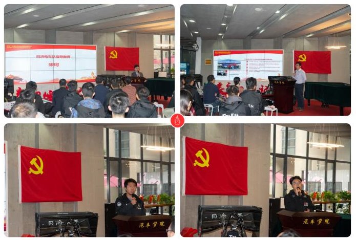 科技创新基地党支部教师党员宋珂、学生党员陈安祥,同济电车队队员张旭分别做了主题分享,他们重新回顾了车队发展的历程和2020年中国赛的点点滴滴,表示将牢记肩上的使命,把创新精神、奋斗精神继续传承发扬。