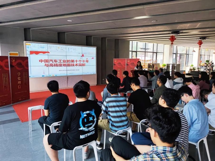 本次活动分为党史学习分享、中国汽车工业发展史与高精度地图技术发展分享两大部分。学生代表结合自身实际,通过《不忘来时路,奋进新征程》分享了中国共产党第十个十年的历史征程,并介绍了2011-2021年汽车工业的发展以及当前较为前沿的高精度地图技术。