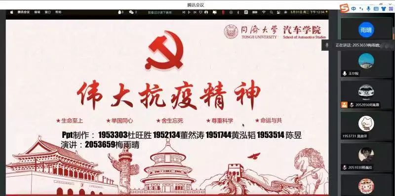 本科生第二党支部的梅雨晴同学为大家详细介绍了伟大抗疫精神。她的讲话围绕抗疫精神提出的背景、抗疫精神的精神内核、抗疫精神的重要意义和抗疫精神对大学生的启示展开。发言内容结合当前具体的疫情防控形势,引发了老师和同学们的共鸣。2020年9月,总书记在全国抗击新冠肺炎疫情表彰大会上明确提出:“生命至上、举国同心、舍生忘死、尊重科学、命运与共”的伟大抗疫精神,这是全国抗击疫情所得来的宝贵经验,也是上海市自三月来疫情防控的伟大指导思想。