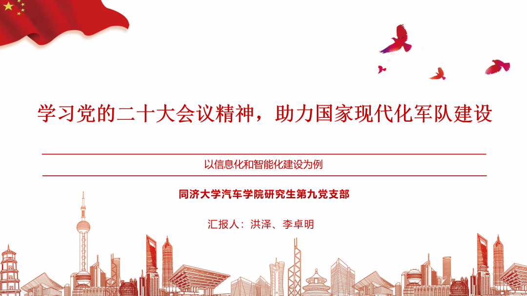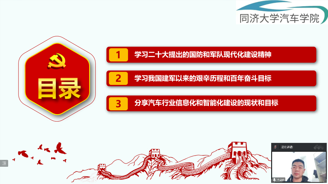 首先,由研究生第九党支部洪泽和李卓明同志带来主题为“学习党的二十大会议精神,助力国家现代化军队建设”的理论知识分享。本次分析重点学习了党的二十大报告中对国防和军队现代化建设的论述,回顾我国国防和军队建设的伟大成就。同时强调了经济发展与科技进步对国防和军队现代化建设的重大作用,鼓励广大汽车青年要积极参与到国防科技进步的事业中,为保障人民的生命财产安全贡献自己的力量。分享结束后,张智明老师补充了p站