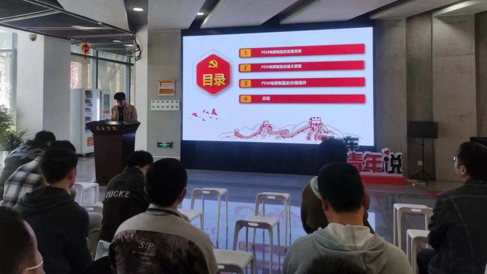 研究生第二党支部刘其林同学带来题目为“质子交换膜电解水制氢技术研究现状与展望”的专业分享。他详细介绍了PEM电解制氢的发展背景、基本原理、关键组件,指出目前各组件的发展现状。他对PEM水电解制氢的发展进行了五项总结:(1)在碳中和大的背景下,未来对于绿氢的需求量巨大,市场体量足够支撑多种制氢技术的应用;(2)PEM制氢技术以其电流密度高、功耗低、动态响应快等优点,是最具应用前景的电解水制氢技术之一;(3)PEM 电解槽具有较高的建设成本,需要通过制造工艺的提升来降低各核心组件的研发成本;(4)PEM 电解槽相比于化石燃料重整制氢,还具有较高的电力成本;(5)PEM 电解制氢具有适配于可再生能源发电的快速响应特性,未来PEM 电解制氢的应用也会逐渐明朗。