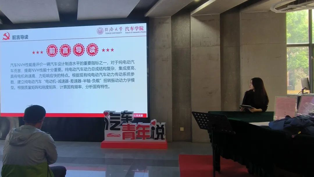 随后,研究生第十七党支部贾棱秋同学进行了题为“纯电汽车动力传动系统扭震特性分析”的专业分享。她从减速器模型、差速器模型、固有特性以及纯电汽车动力传动系统的发展现状等四个方面进行介绍。综合纯电汽车动力传动系统的发展现状,她指出目前仍存在以下问题:(1)减速器和差速器中存在扭转振动,影响传动系统固有特性;(2)永磁同步电机控制策略中需要配合建立闭环系统控制环;(3)永磁同步电机输出转矩存在转矩波动,影响传动系统。