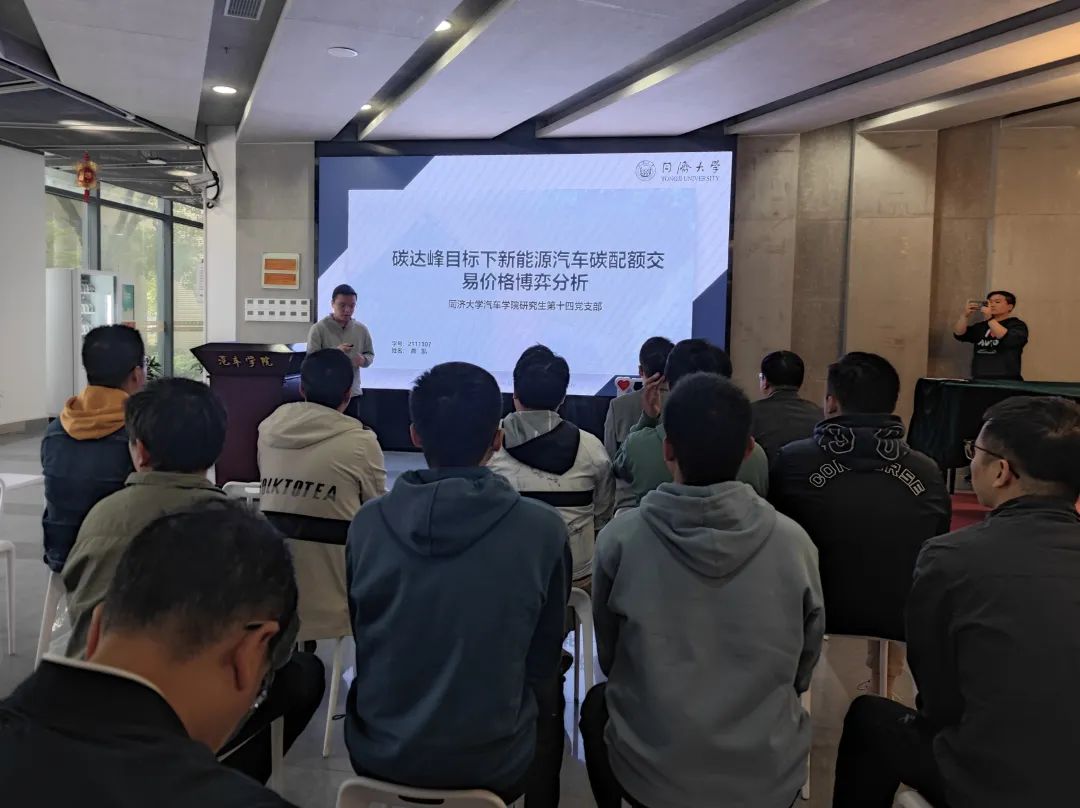 随后,由研究生第十四党支部的尚凯同志带来了题为“碳达峰目标下新能源汽车碳配额交易价格博弈分析”的理论分享。这篇分析以碳达峰目标下新能源汽车碳配额交易价值研究为主要问题,通过设定双碳目标下碳配额总量、估算二氧化碳边际减排成本等一系列研究思路,提出了系统动力学模型、车辆周期碳排放核算与燃料周期碳排放、基于距离函数的边际减排成本模型、政府与企业间的分配博弈模型、企业买方与企业买方的价格博弈模型,解决了基于全生命周期碳排放总量的设定、二氧化碳边际减排成本的拟合曲线、汽车企业的碳配额分配结果、新能源汽车碳配额的交易价格等问题。
