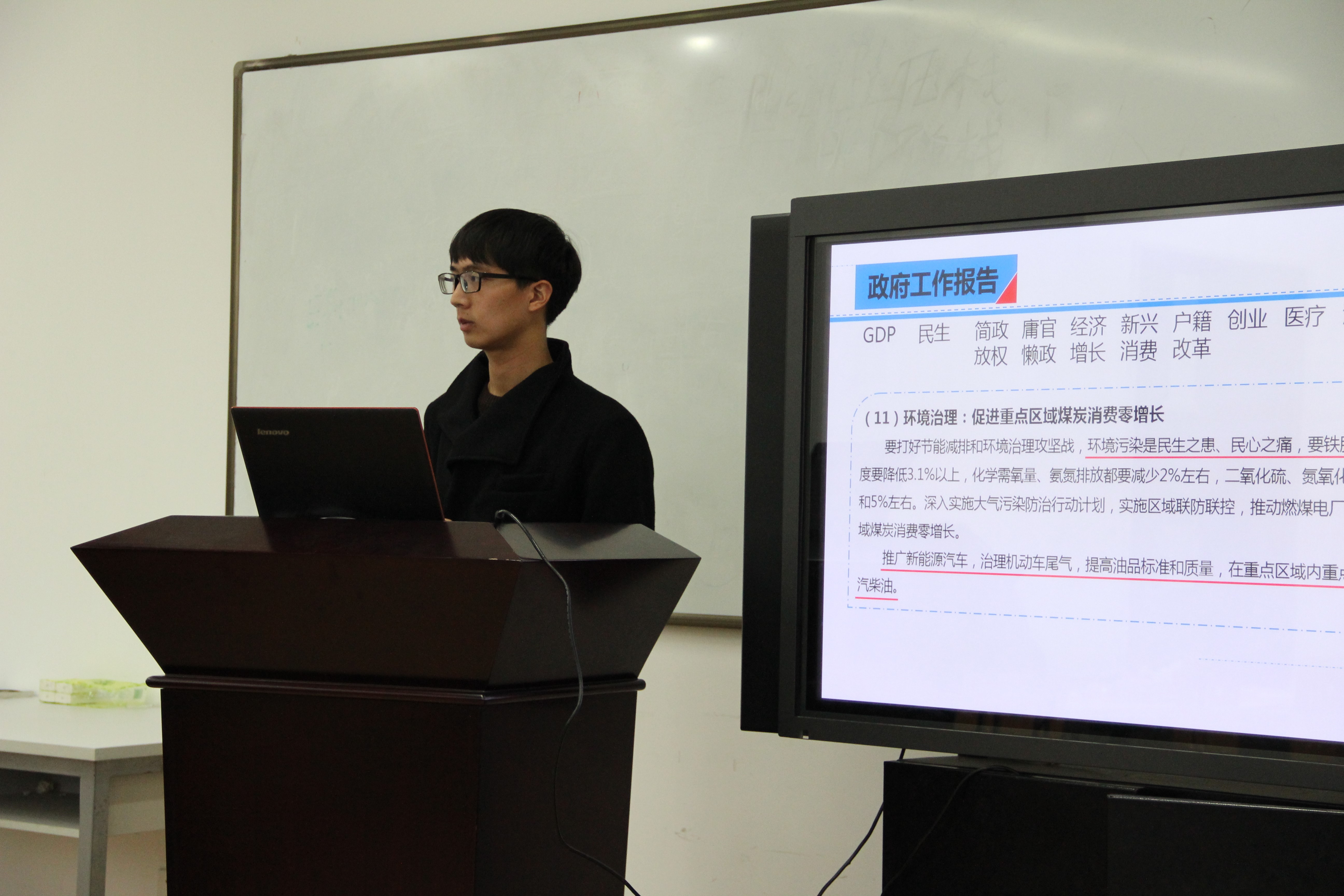 2015年5月28日下午,由2014级学术硕士二支部举办的“时政座谈会”在学院B205教室进行,此次时政座谈会的主题是“汽车与环境”。座谈会之前各小组进行各自学习、总结,座谈会上解读并分享小组对“汽车与环境”这一主题的学习和理解。