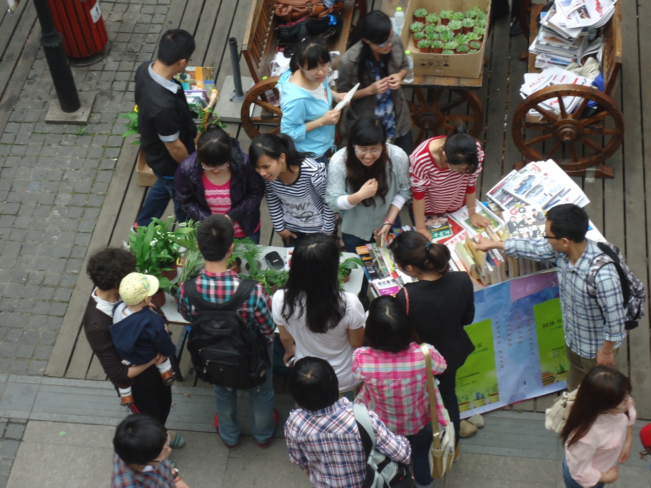 “图书交换”活动启动仪式在新天地广场举办。活动当天,最吸引学生注意力的是各式各样的盆栽和摆满桌子的书籍,同学们纷纷驻足询问,并带来自己闲置的书籍,学术硕士二支部党员同志将盆栽作为纪念品赠与捐书的同学,现场气氛极为活跃,直到启动仪式结束时已募集同学捐出的闲置书籍一百余本,包括专业书籍、文学书籍、语言类、杂志等多种类别,达到了我们的前期宣传效果。