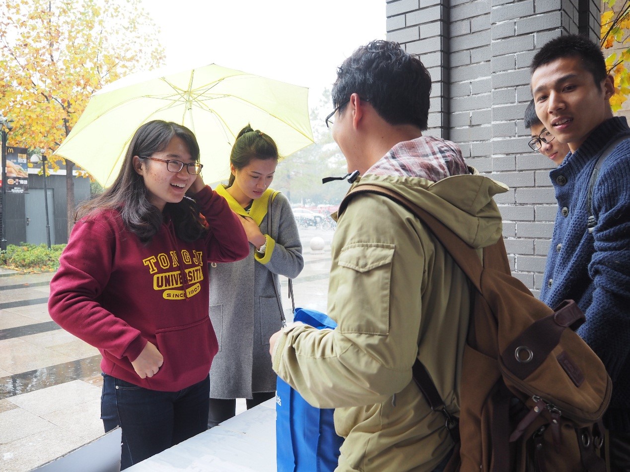 的两个微信公共平台,关注的同学便可以得到精美礼品,包括精美水杯、汽院·嘉定十年明信片以及神秘彩蛋。同学们似乎对奖品很感兴趣,尤其对于彩蛋内的物品十分好奇,便参与进我们的活动:纷纷拿出手机关注我们的p站