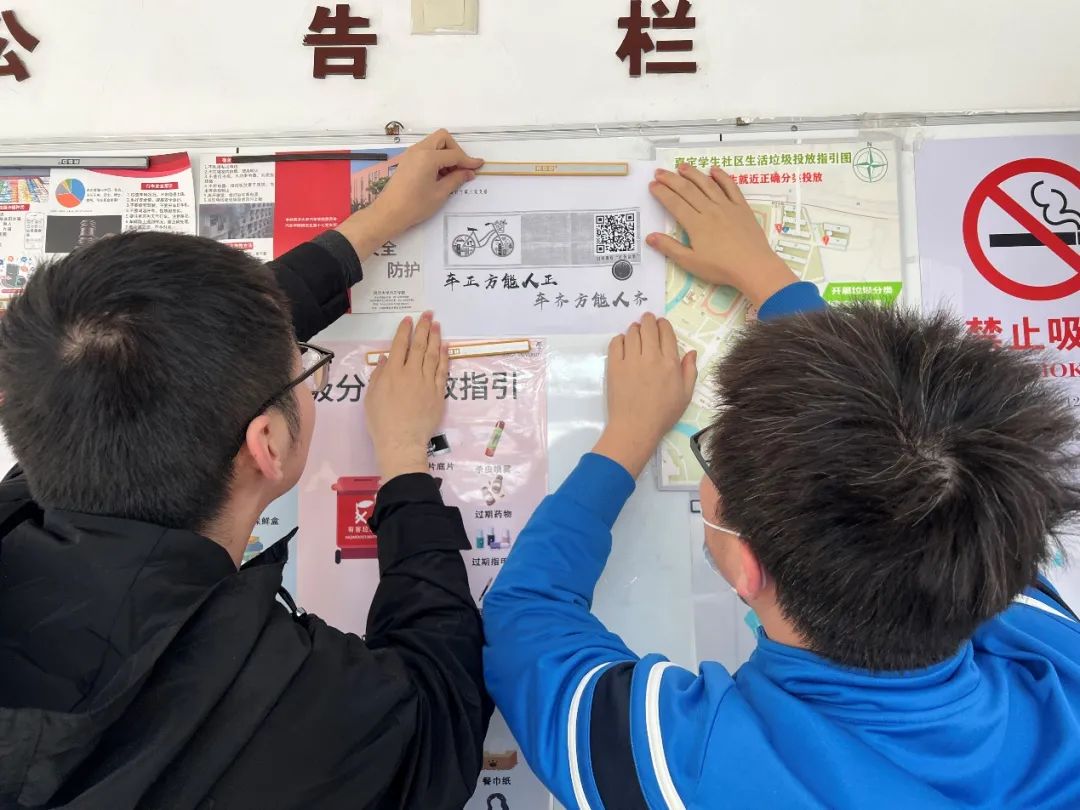 首先我们通过在学校的公告栏中张贴共享单车规范摆放的宣传标语来呼吁广大同学们参与到共享单车规范出行的活动中。标语中的二维码则是我们为庆祝中国共产党百年华诞为大家准备的红色故事,旨在让大家在享受如今便捷生活的同时,不忘先辈的艰苦奋斗。