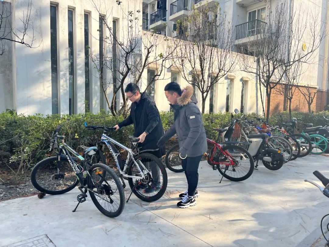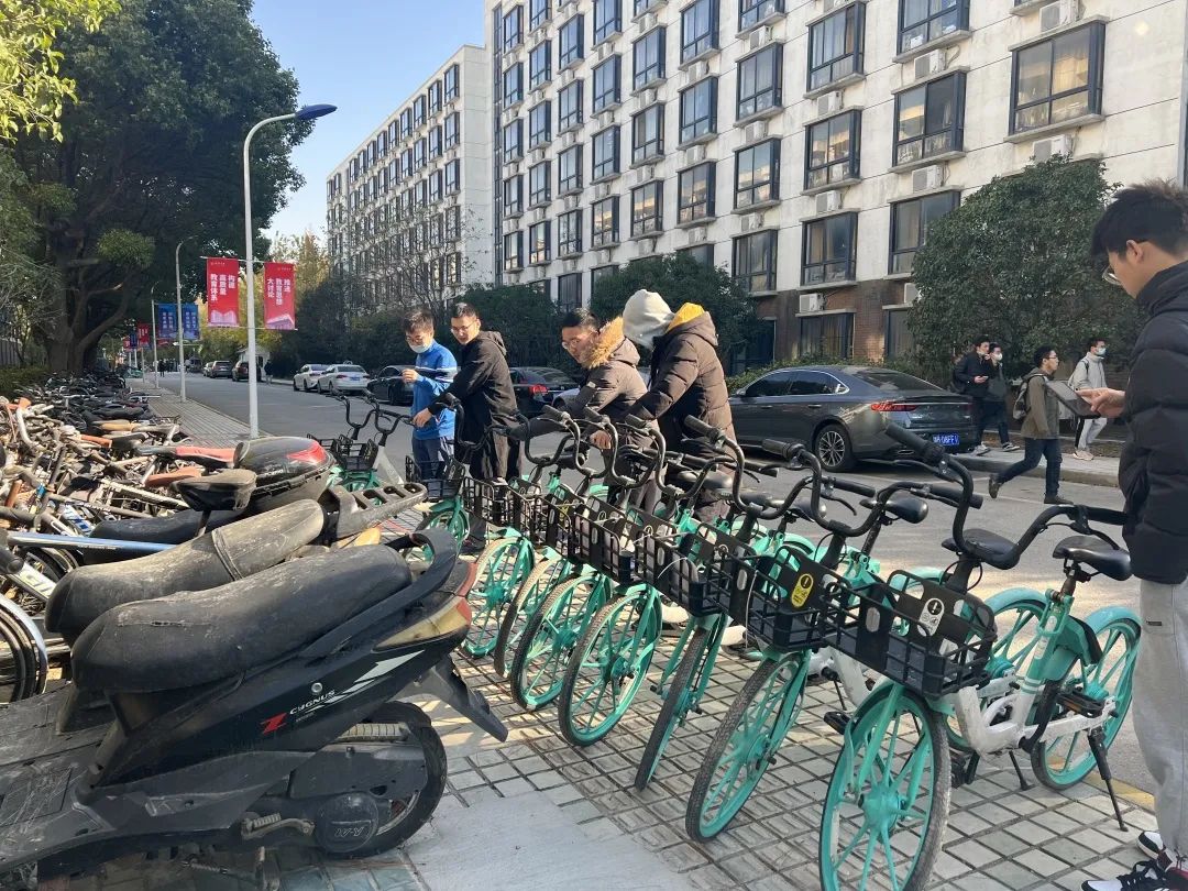 然后,我们对校园内随意放置的单车进行了规范摆放。可以看到校园内单车随意摆放的问题虽不严重但仍然是存在的,这并不局限于共享单车,还包括学生单车或电瓶车。在小组同学的共同努力下,原本散乱的自行车瞬间变得整整齐齐、焕然一新。