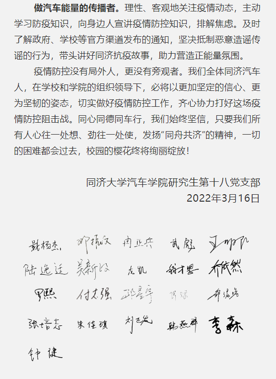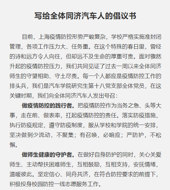 疫情在前,使命在肩,校园转入准封闭管理后,支部全体党员向同济汽车人发出“同舟共济 共克时艰”的倡议,号召全体师生做疫情防控的践行者、师生健康的守护者、同济精神的传播者。目前有706名师生积极响应,用实际行动投入到学校、社区的疫情防控工作中。支部设计制作疫情防控宣传海报,在校区宣传栏、楼宇张贴,倡导大家坚持防疫“三件套”,牢记防护“五还要”,引导广大师生坚定战胜疫情的信心。