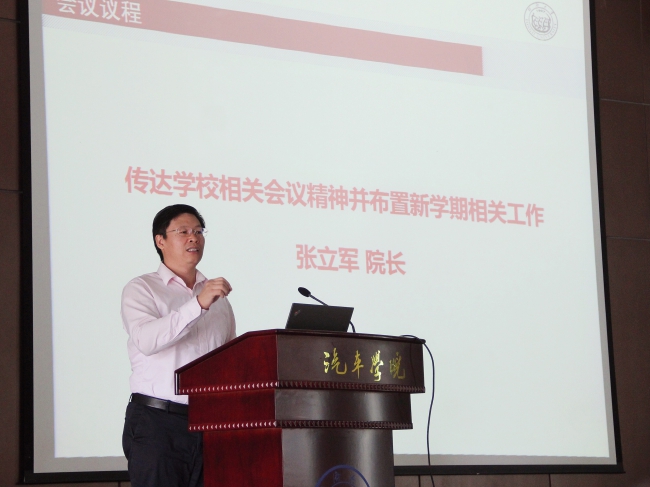 张立军院长向大家传达了近期学校相关会议精神,介绍了学校长聘教职体系改革、2019年度全校专业技术职务评聘及考核续聘工作的有关情况,并就新学期各项工作做了布置,重点推进人才培养、学科规划、教师队伍建设等工作。张院长指出,学院教师要统一思想、不忘初心、牢记使命,积极为学院各项工作建言献策,帮助学院开拓新思路,实现教学、科研工作质量实效提升。