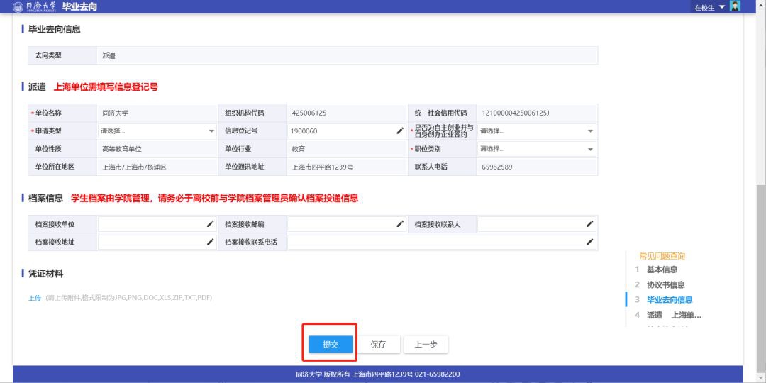 就业网,选择毕业去向-》派遣并填写用人单位具体信息,确认无误后点击提交: