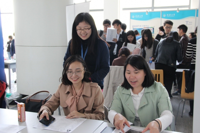 甚至外校、外地大量同学积极参与,。前来应聘的同学摩肩接踵,现场热闹非凡。参与的学生和企业均对p站
