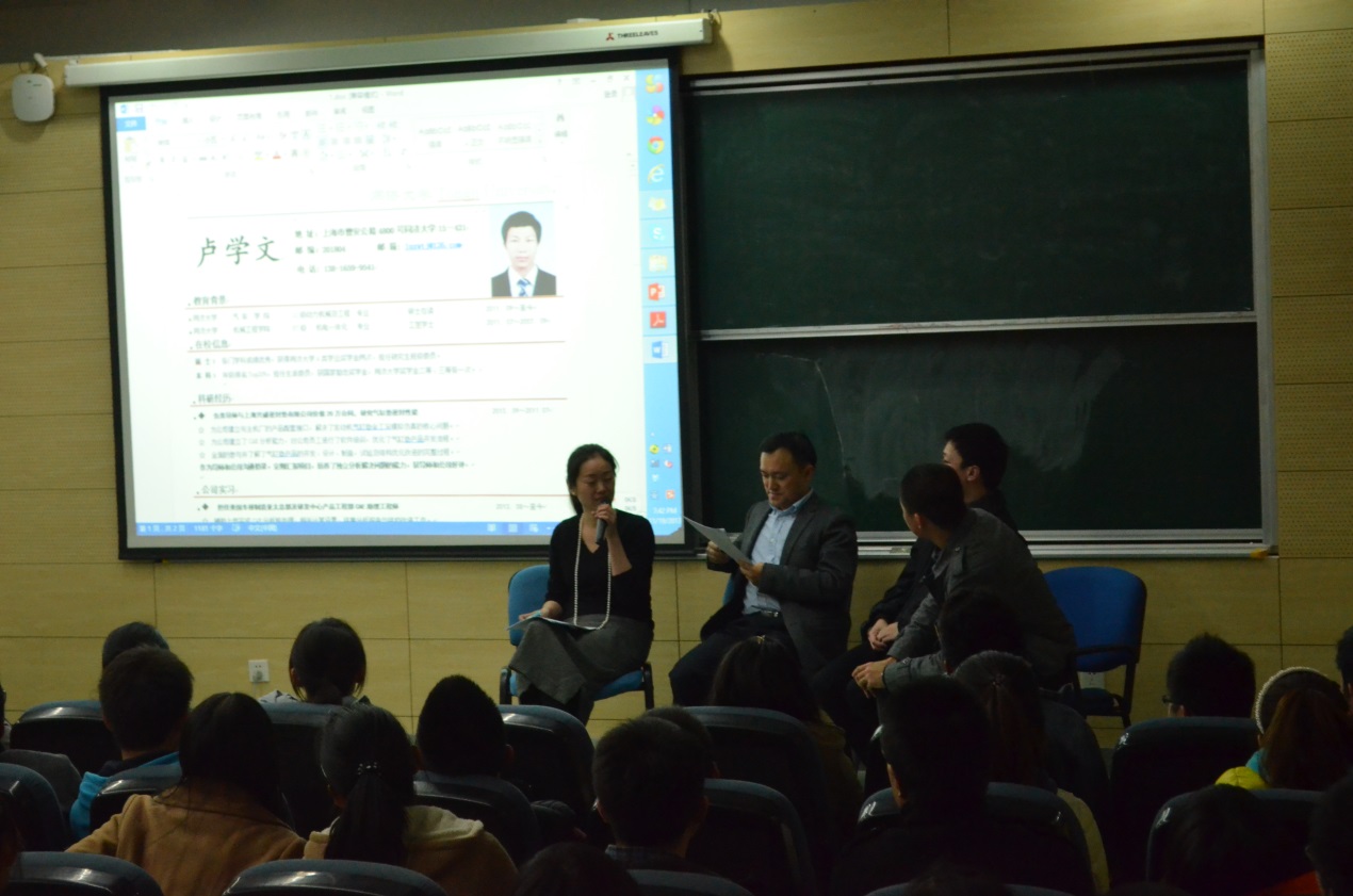 培训开始由江总向大家做了关于职业发展的简短演说,接着由两位学长向大家传授自身的经验。接着培训进入访谈环节,现场气氛也逐渐高涨,四位嘉宾现场对同学们投来的简历进行点评,和蔼的曹女士从正面肯定了一些同学的简历制作,而学长们则不留情面地指出存在的缺点,畅谈开后,两位舍弗勒的高管揭露了一些HR内心的一些“小黑暗”,毫无保留地给大家介绍了一些组织简历和面试中的小诀窍。