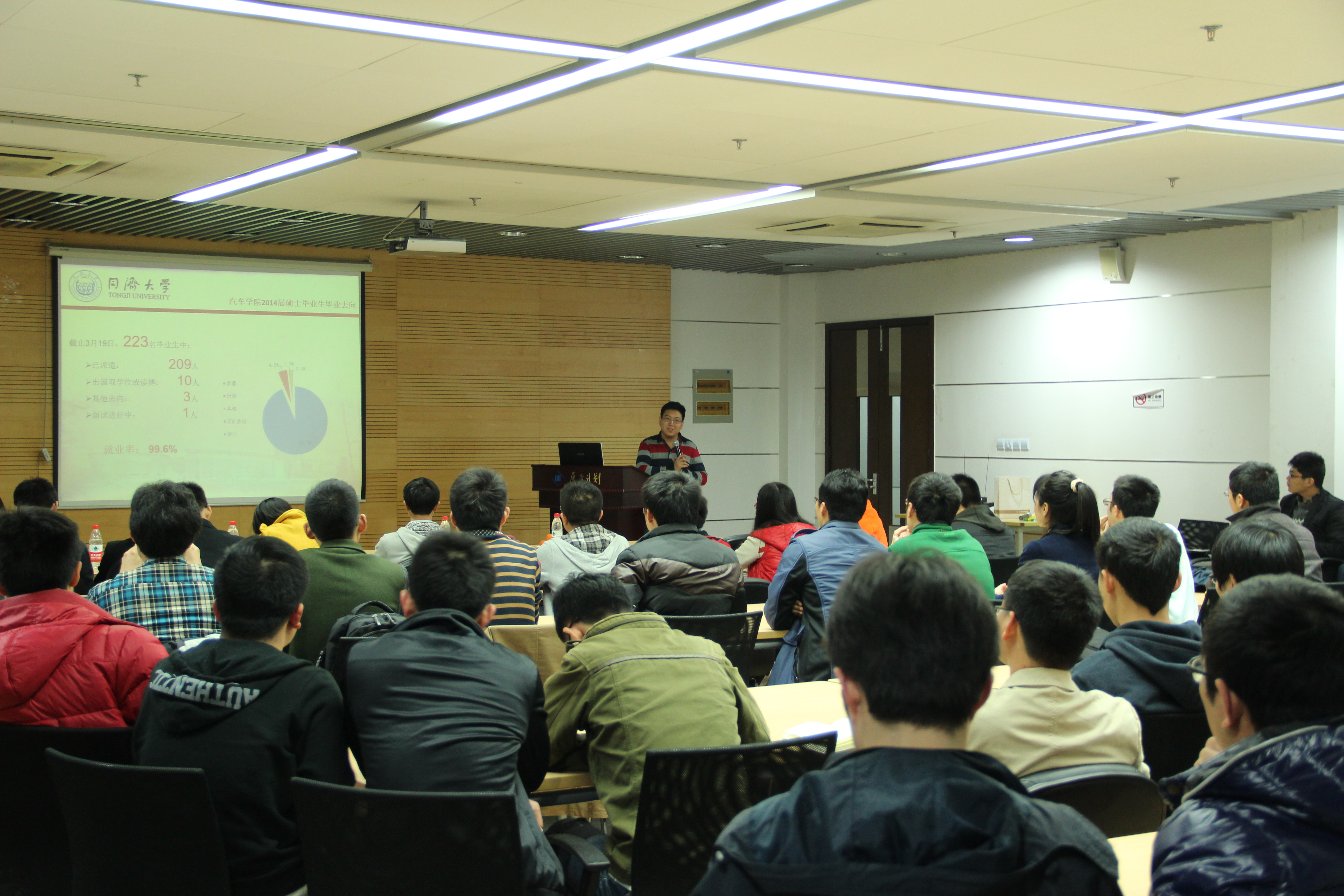 学工办主管就业的房亮老师以及2011级的史佳薇、骆威、李云鹏、张宽宽四位非常优秀的毕业生作为嘉宾,与到场的近百名同学们一起分享他们关于求职就业的信息和经验。活动由2012级硕士专业型第一党支部策划主办,并得到了学院的大力支持。