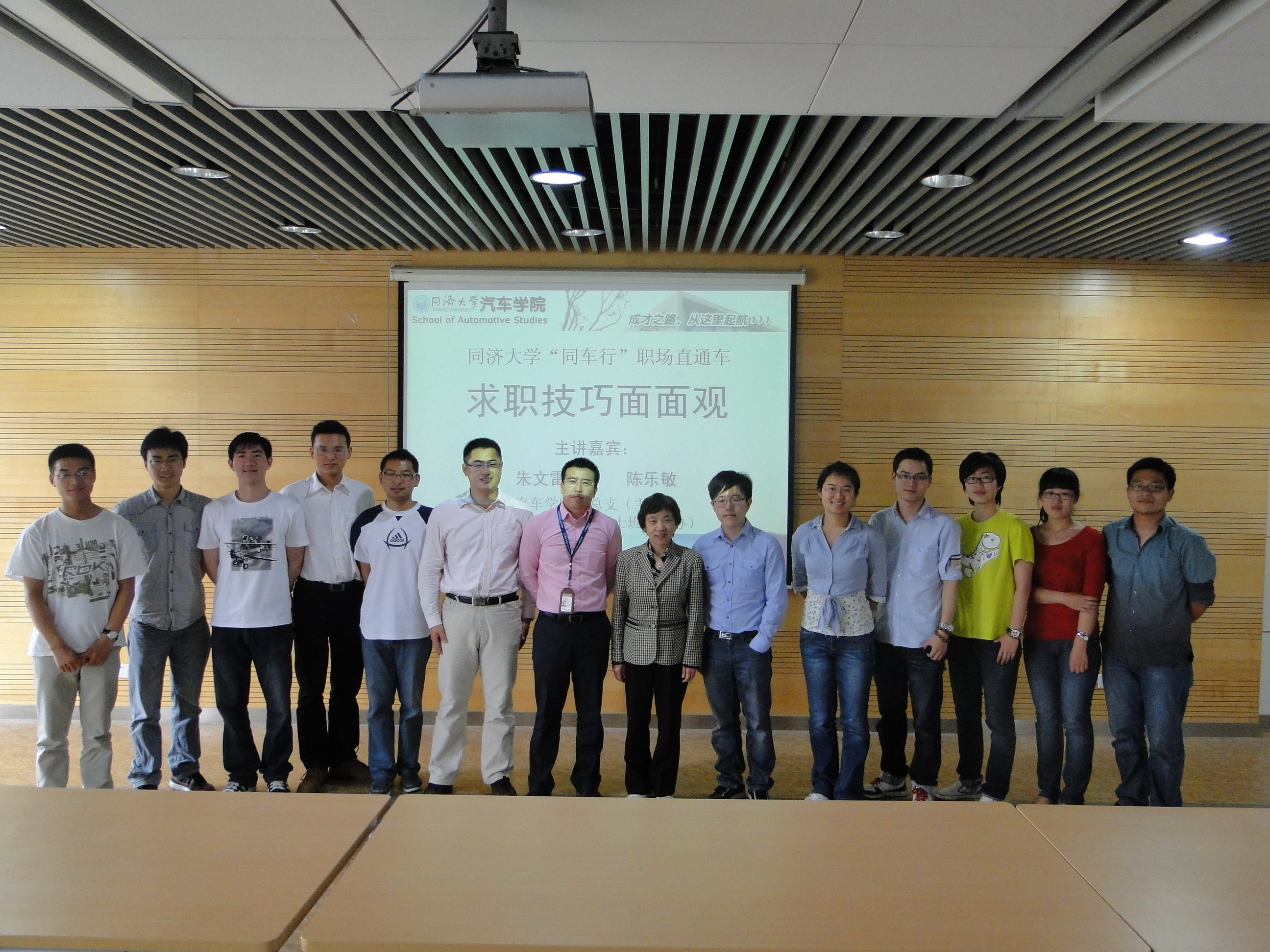 “同车行”求职技巧面面观活动在学院大楼A311举行。此次活动邀请到了上汽乘用车公司人力资源部人员配置与招聘主管朱文雷和同济校友——上汽物流部主管陈乐敏学长,他们就求职面试中的技巧以及毕业生初入职场的发展与同学们进行了座谈。学院学工办刘海峰、葛畅老师以及2010级硕士班主任高申兰老师出席了此次交流活动,活动由2010级硕士班委赵宇伟同学主持。
