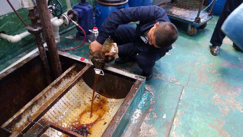 ⑦ 收运员将“地沟油”倒入预处理池,部分杂物被隔离栅挡在外面。图中用小油桶装的是餐厅后厨用剩下的“老油”,属于品质相当好的废油脂,收运量较少。