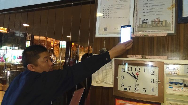 将收集桶过秤后,收运员打开手机里的“上海餐厨废弃油脂管理系统”,扫描火锅店前台墙面上的二维码,系统自动跳出收运地点和时间,收运员再录入收运量等信息后,相关信息便实时传输到企业和监管部门后台。