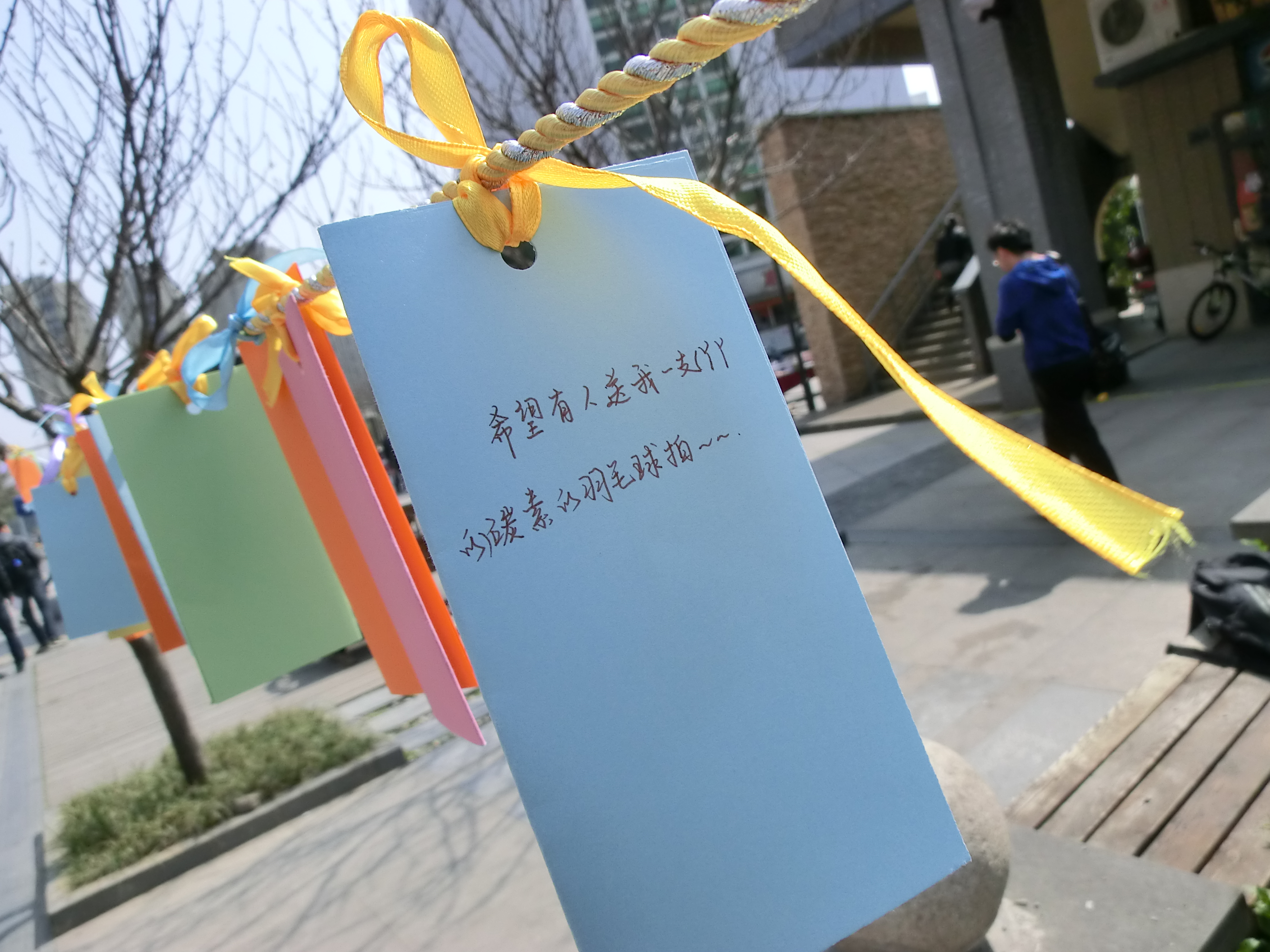 女生提前写好的心愿卡挂在绳子上,并在新天地、寝室楼道里进行展示,由男生们观阅挑选,摘下心愿卡后便为其主人实现她的愿望。在周二的新天地活动当天,往来人流络绎不绝,而时时都有驻足欣赏心愿卡的同学,或许是出于好奇,或许确实想为女生们带去一份心意,无论如何都将为挂卡人和摘卡人创造出一段美好的邂逅与回忆。