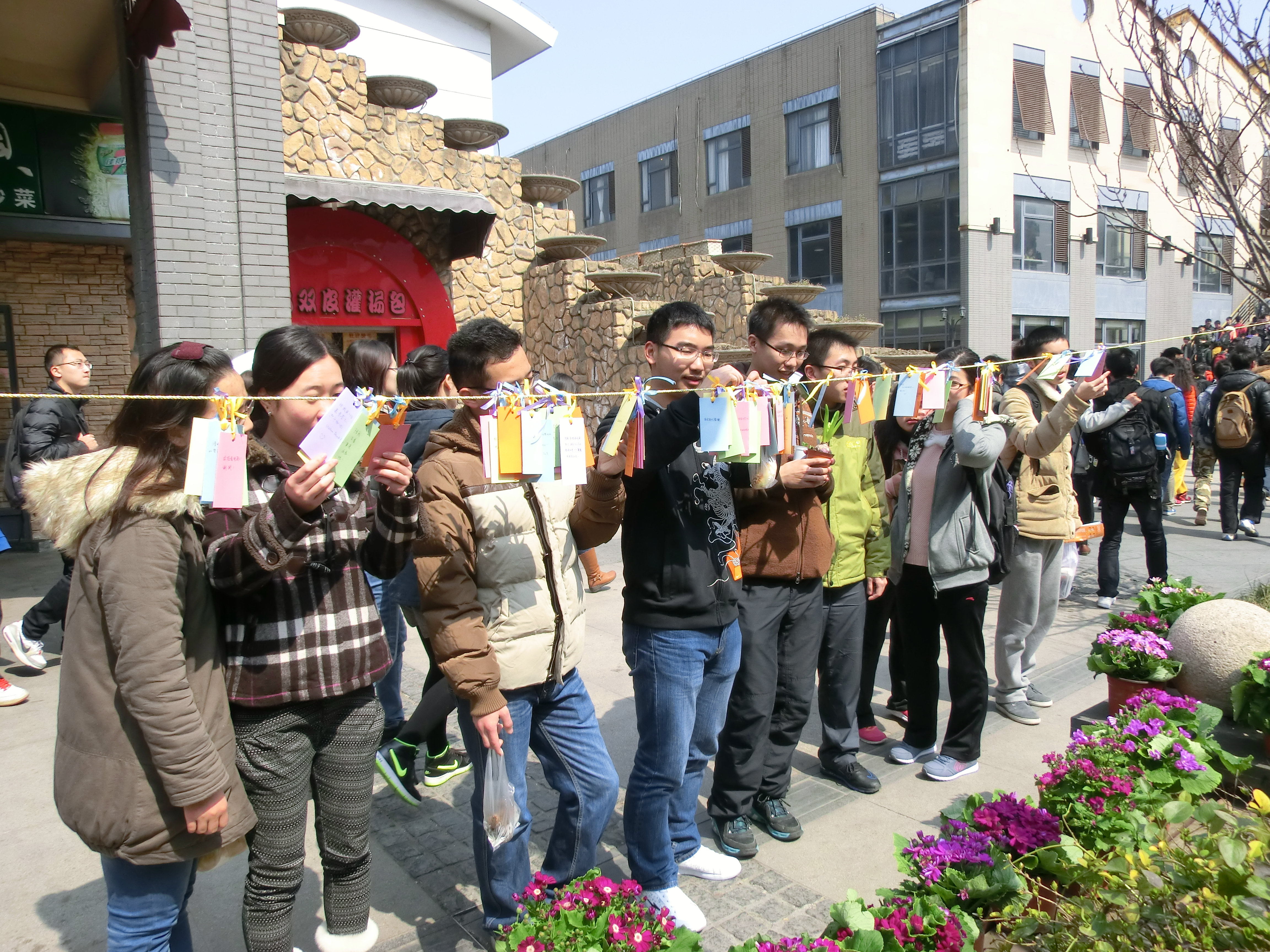 女生节新添的活动之一。本着与绿色校园相结合的理念,学生会工作人员专门从安亭花鸟市场订购了不同种类的花草盆栽,有的以班级为代表由班长赠送给p站