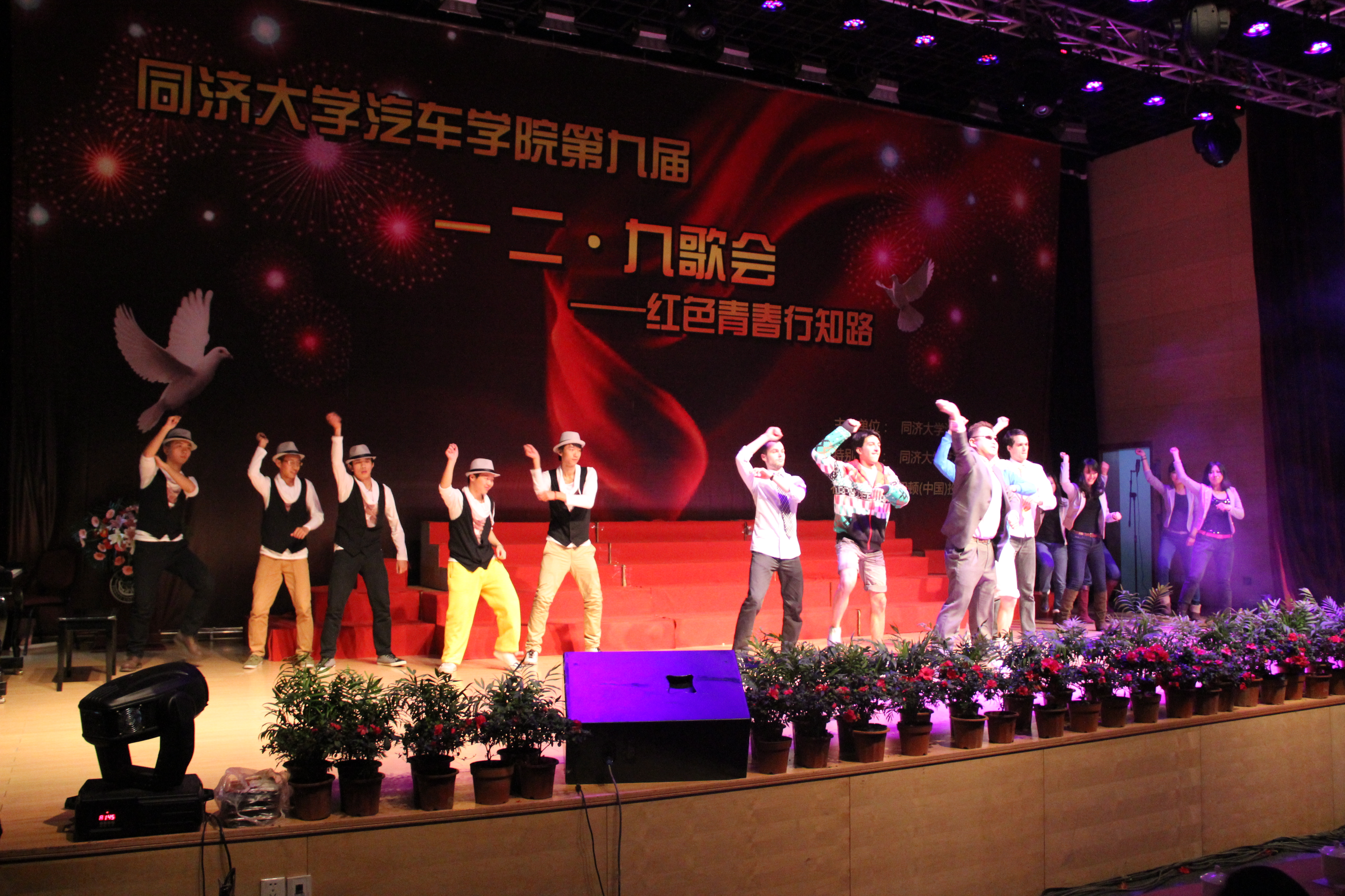 一二·九在留学生和本科生的精彩舞蹈中拉开了帷幕。11级学生气势磅礴的《黄河大合唱》一下子震惊全场,12级学生稚嫩的歌声为大家带来了《红旗飘飘》……此次歌会共有16支参赛队伍、3支表演队伍,班主任与班级同学同台献唱,向全场展示了班级的精神风貌。上海汽车乘用车公司的精彩表演和安亭小学小朋友的可爱的表演瞬间让全场的气氛又一次HIGH了起来。拥有十多年历史的EP节能车队不仅在赛场上叱咤风云,今晚也为大家带来了自己谱写的队歌,感动了全场的观众。在表演合唱的同时,两边的微博墙和班级的介绍视频让晚会气氛活跃。学院教师代表对为大家带来了《国家》,老师们深情的演唱感染了在场的同学,学生发微薄表示“国是荣誉的毅力,家是幸福的洋溢,p站