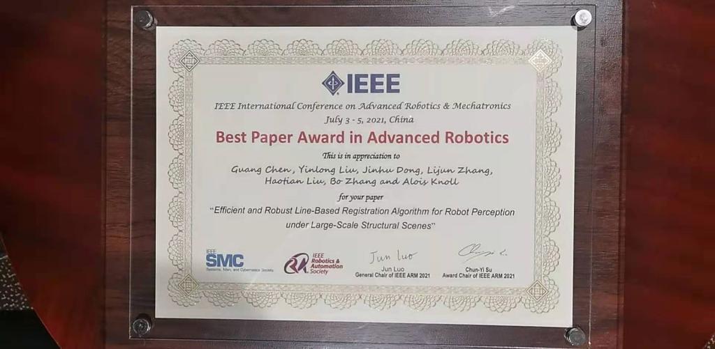 陈广老师课题组联合慕尼黑工业大学和上海西井信息科技有限公司共同完成的论文《Efficient and Robust Line-based Registration Algorithm for Robot Perception Under Large-scale Structural Scenes》被会议接收,并获得最佳先进机器人会议论文奖、会议最佳论文提名奖。该论文提出了一种新型基于线特征的点云配准算法,创造性设计将旋转和平移进行解耦求解的思路,降低了解空间的维度,提升了优化算法的效率,为自动驾驶车辆在结构化场景中的鲁棒感知和自主导航定位提供了新的方案。