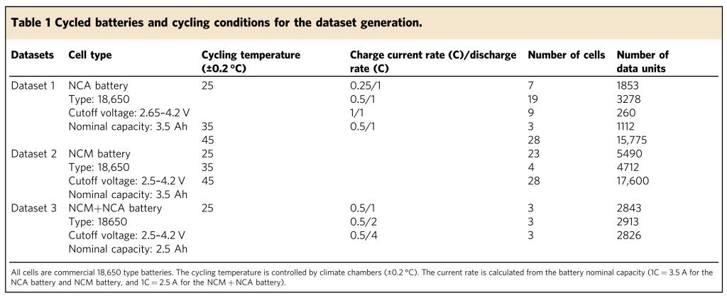 研究成果公开了三款不同材料体系商用锂离子动力电池长循环测试数据如表1,包含130颗电池单体,每颗单体根据不同实验条件循环了50~1400次,实验条件包含了3个温度点(25oC, 35 oC, 45 oC),5个充放电倍率(0.25C, 0.5C, 1C, 2C, 4C)。数据开放获取链接为://doi.org/10.5281/zenodo.6379165。