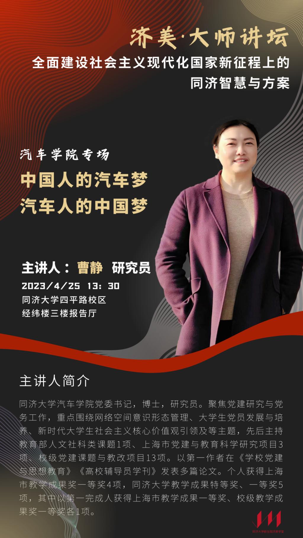 党委书记曹静研究员为新生讲授《中国人的汽车梦 汽车人的中国梦》。济美学堂副院长方璐出席活动,活动由济美学堂辅导员李文迪主持,新生院百余名师生现场参与学习。